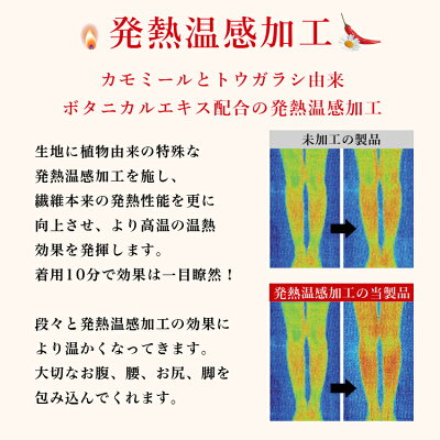 毛玉(ピリング)検査 驚きのMAX5級! ●発熱温感加工 カモミールとトウガラシ由来のハーブエキス加工 生地に特殊な発熱温感加工を施し、繊維本来の発熱性能を更に向上させ、 より高温の温熱効果を発揮します。
