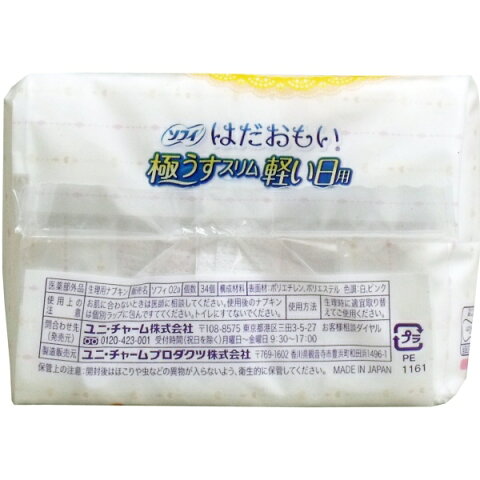 ユニ・チャーム株式会社個装サイズ:140X95X73mm個装重量:約100g内容量:34個入製造国:日本【発売元:ユニ・チャーム】【医薬部外品】生理用ナプキン【構成材料】表面剤・・・ポリエステル、ポリエチレン色調・・・白、ピンク【使用方法】・生理時に適宜取り替えてください。