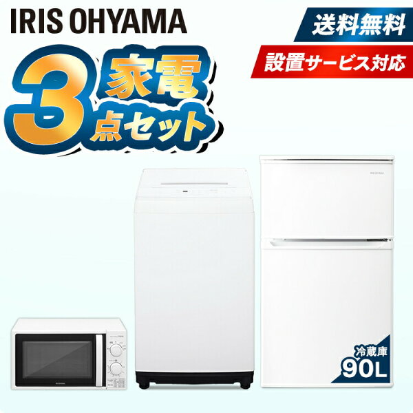 ■セット内容・冷凍冷蔵庫90L IRSD-9B-W ホワイト・縦型洗濯機 5.0kg IAW-T503E-W ホワイト・単機能レンジ ターンテーブル 17L ホワイト IMG-T177-5-W 50Hz東日本/IMG-T177-6-W 60Hz西日本【冷凍冷蔵庫90L IRSD-9B-W ホワイト】●種類:冷凍冷蔵庫●定格内容積:全体/90L(冷凍室:28L/冷蔵室:62L)●ドア数:2●商品サイズ(cm):幅約47.8×奥行約50.9×高さ約85.2●質量:約28kg●定格電源:AC100V 50Hz/60Hz●定格消費電力:電動機:53W/58W、電熱装置:8W/8W●冷凍室/冷凍室扉棚の性能記号:フォースター/ツースター冷凍負荷温度(食品温度):-18℃以下/-12℃以下冷凍食品の貯蔵期間の目安:約3か月/約1か月●ドア開閉方向:右開き●電源コード長:1.8m●トップテーブル(天板)耐荷重:30kg●トップテーブル(天板)耐熱温度:100℃●付属品:製氷皿、貯氷ケース、露取り用ヘラ、冷凍室棚【縦型洗濯機 5.0kg IAW-T503E-W ホワイト】●種類:全自動電気洗濯機●定格電圧:AC100V●定格電源周波数:50/60Hz●定格消費電力:245/300W●標準洗濯容量:5.0kg●標準脱水容量:5.0kg●標準使用水量:120L●標準水量:46L●防水レベル:IPX4●外形寸法(cm):幅約55.5×奥行約52.5×高さ約92●質量:約31kg●付属品:給水ホース(約0.8m)【単機能レンジ ターンテーブル 17L ホワイト IMG-T177-5-W IMG-T177-6-W】●商品サイズ(cm)(ハンドル、突出部を除く):幅約45.5×奥行約31.5×高さ約26.5●加熱室有効サイズ(cm):幅約30.5×奥行約28.0×高さ約17.5●丸皿径:約24.5cm●庫内総容量:約17L※1●質量:約10.5kg●型番:IMG-T177-5-W:周波数50Hz専用(東日本)、IMG-T177-6-W:周波数60Hz専用(西日本)●電源:AC100V(50Hzまたは60Hz専用)●定格消費電力:1100W●定格高周波出力:700W、600W、500W、弱(300W)、解凍(200W)、煮込み(120W)●発振周波数:2450MHz●タイマー:15分●区分名:A※2●電子レンジ機能の年間消費電力量:50Hz・59.6kWh/年、60Hz ・ 58.9kWh/年※3●年間待機時消費電力量:0.0kWh※3●年間消費電力量:50Hz・59.6kWh/年、60Hz ・ 58.9kWh/年※3●電源コードの長さ:1.5m※1 庫内総容量とは、JISの判断基準にもとづき算出された容量です。